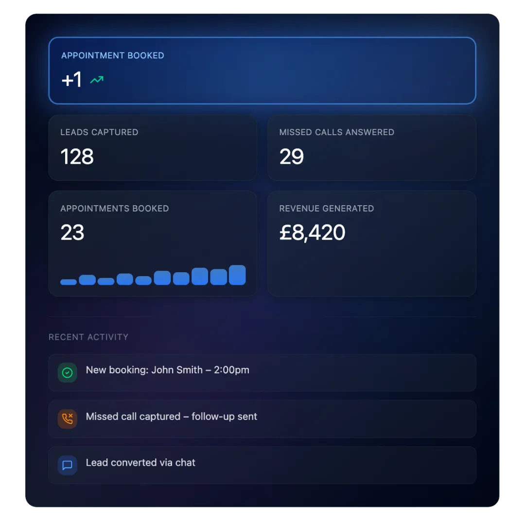 Our system captures, qualifies and converts every enquiry instantly — recovering revenue that would’ve otherwise gone to faster competitors.